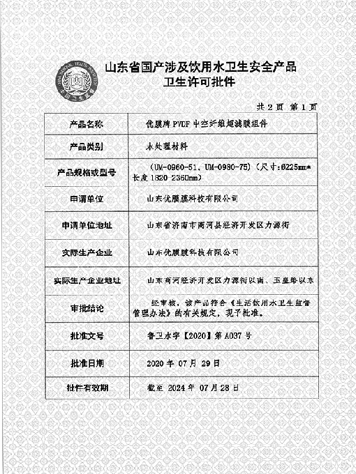 2020年7月29日,優(yōu)膜牌PVDF中空纖維超濾膜組件獲批“山東省國(guó)產(chǎn)涉及飲用水衛(wèi)生安全產(chǎn)品衛(wèi)生許可批件”證書(shū),產(chǎn)品符合國(guó)家規(guī)范和標(biāo)準(zhǔn)。山東